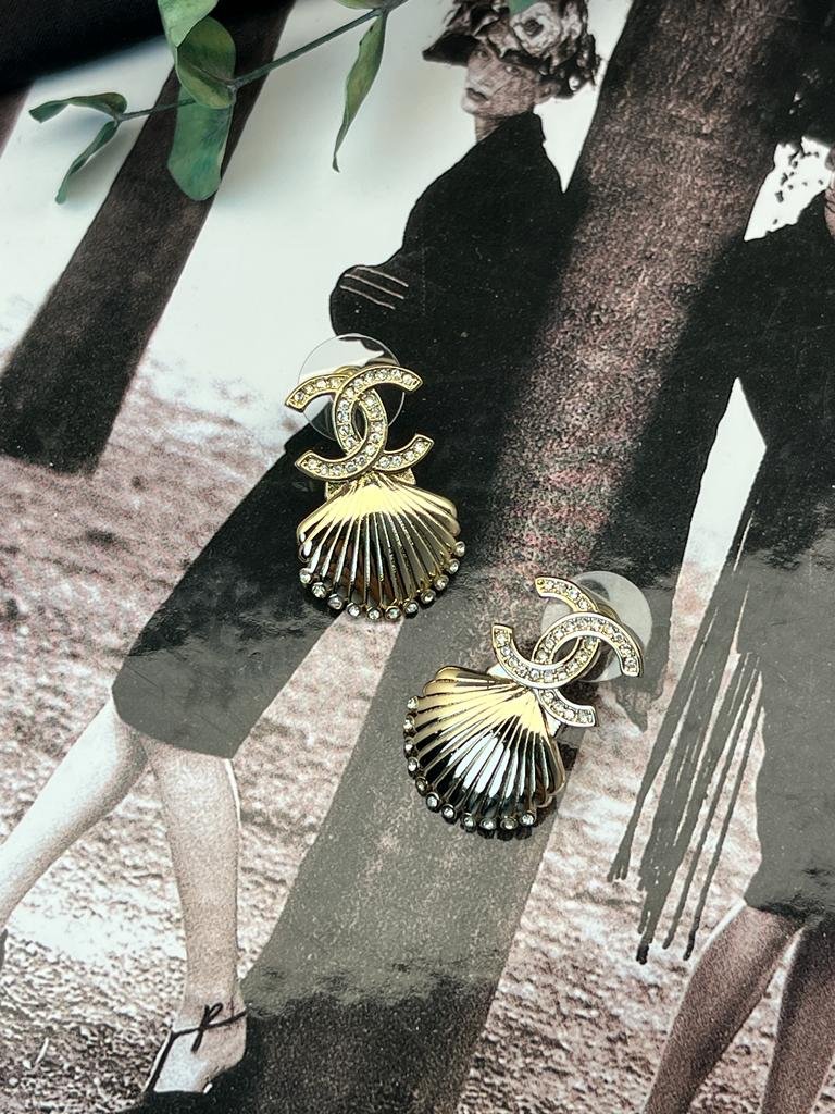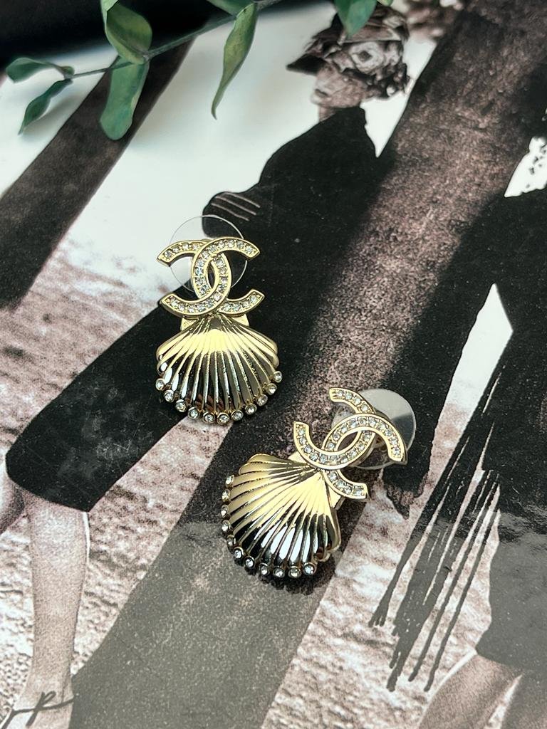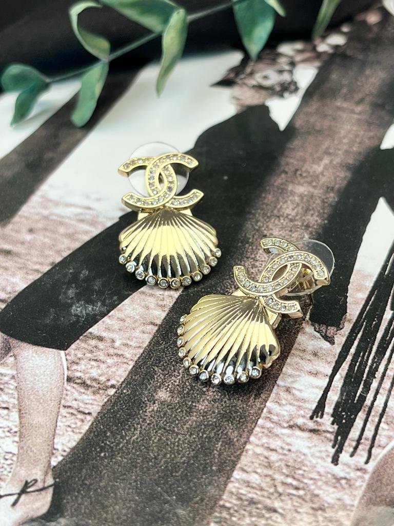 İthal, gold renkli taşlı istiridye figürlü küpe